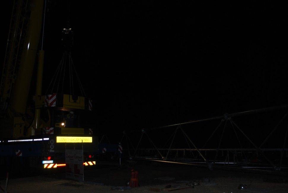 Le pylône a été monté au sol dans la semaine du 20 mars. Dans la nuit du 28 mars , pour sécuriser les manœuvres par rapport à la voie ferrée (fermeture du trafic) , le pylône a été soulevé par une énorme grue et posé sur le socle prévu. Manœuvre impressionnante pour laquelle les principales étapes sont présentées ci-dessous.