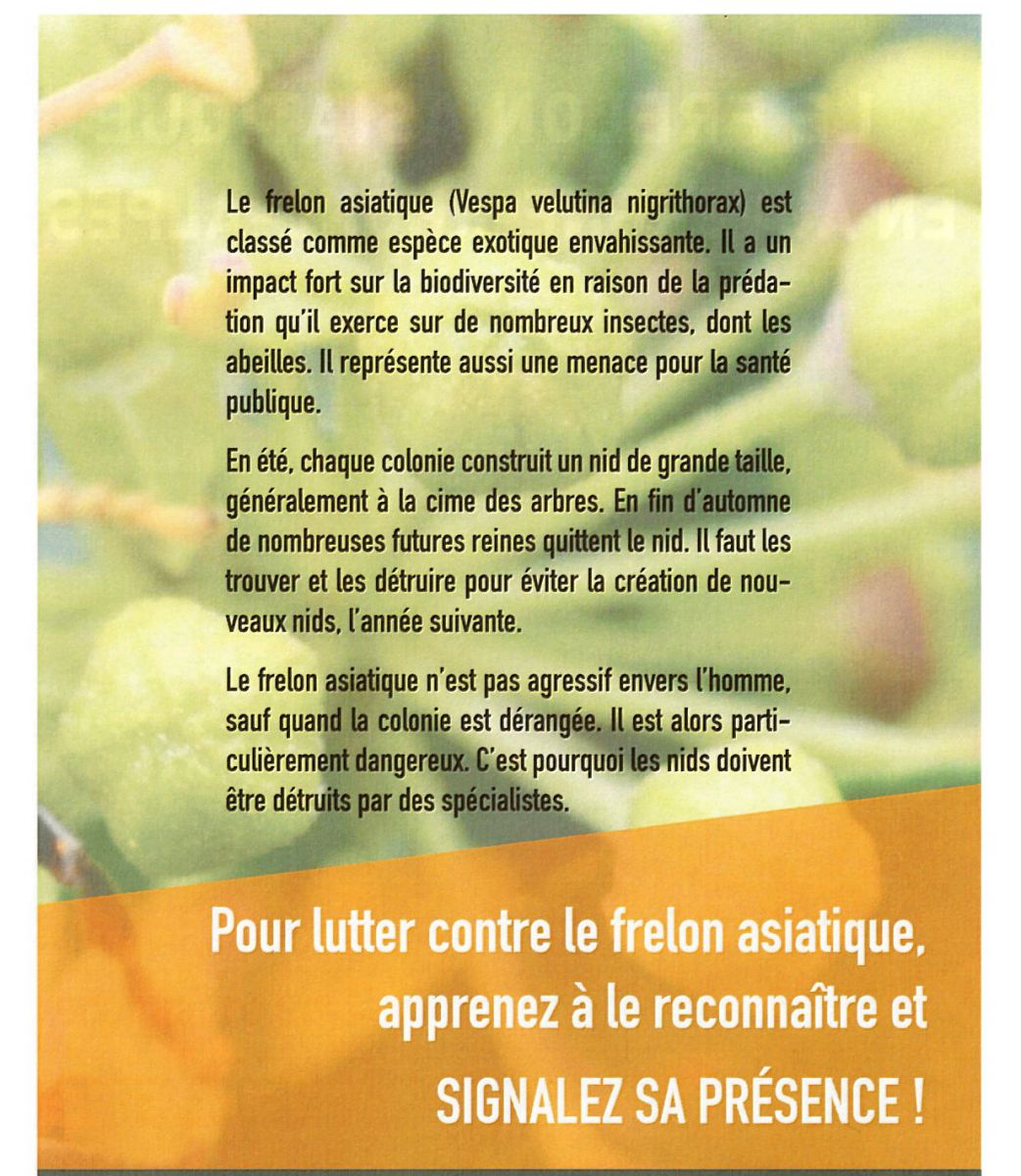 Cet insecte très agressif est un prédateur redoutable des abeilles qui représentent 45% de son régime alimentaire. Ils sont devenus en quelques années l'un des fléaux les plus inquiétants dans la campagne mais aussi en ville.