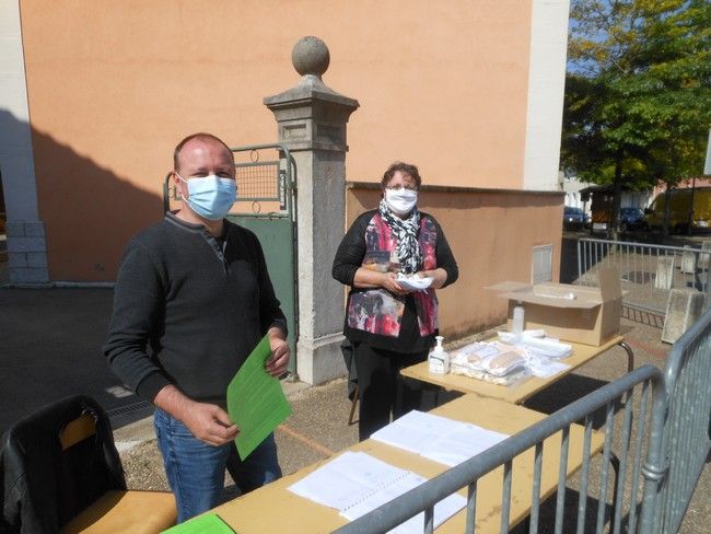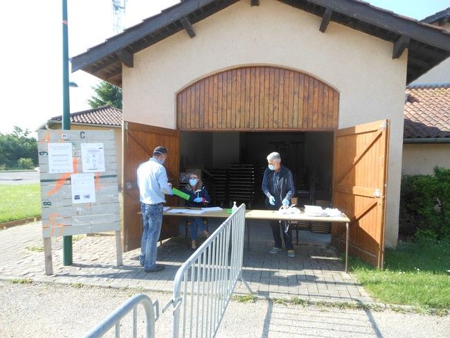 Pour sécuriser l'opération , 3 endroits ont été établis pour la mise à disposition : mairie , salle des Fêtes , école . Le beau temps a permis de faire la distribution en extérieur , limitant encore le risque.