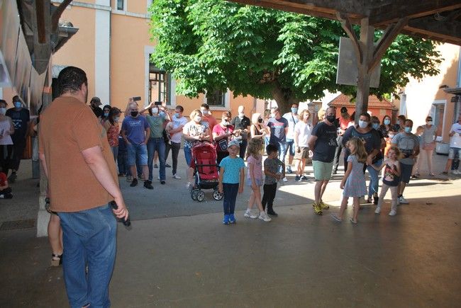 Beaucoup de monde dans la cour de l'école , parents , professeurs élèves , en présence du maire et de deux adjoints de Marlieux ,Chantal Dessertine et Michel Alberti.