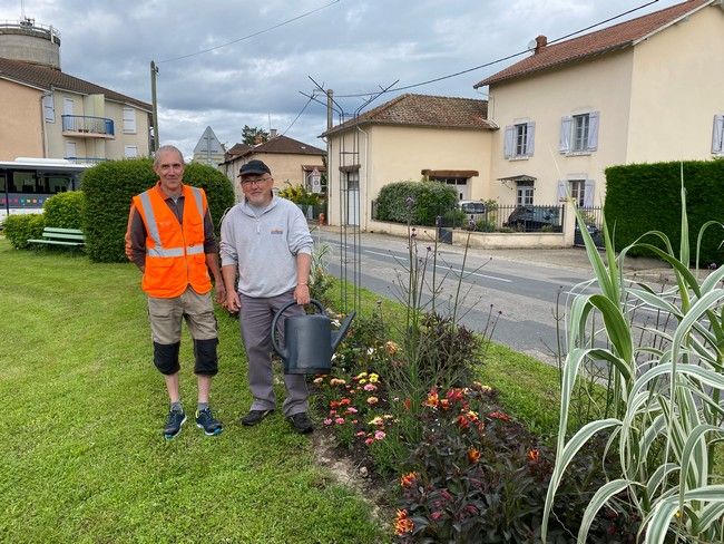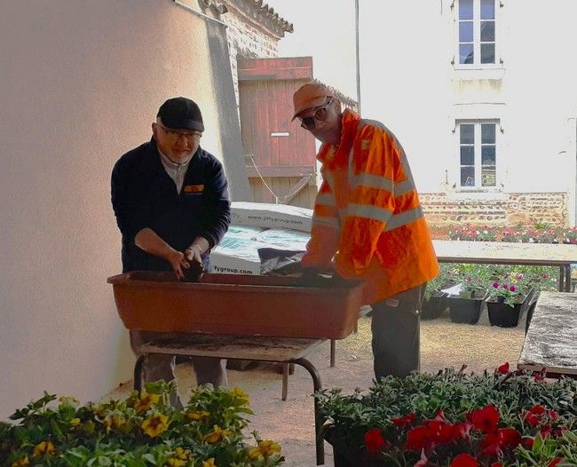 Fin mai , les employés communaux , David GALLET et Laurent MOUSSY , aidés par les membres de la Commission Fleurissement et quelques bénévoles motivés ont mis en place plus de 500 plants dans les massifs et jardinières pour donner au Village de belles couleurs dans les mois qui viennent.