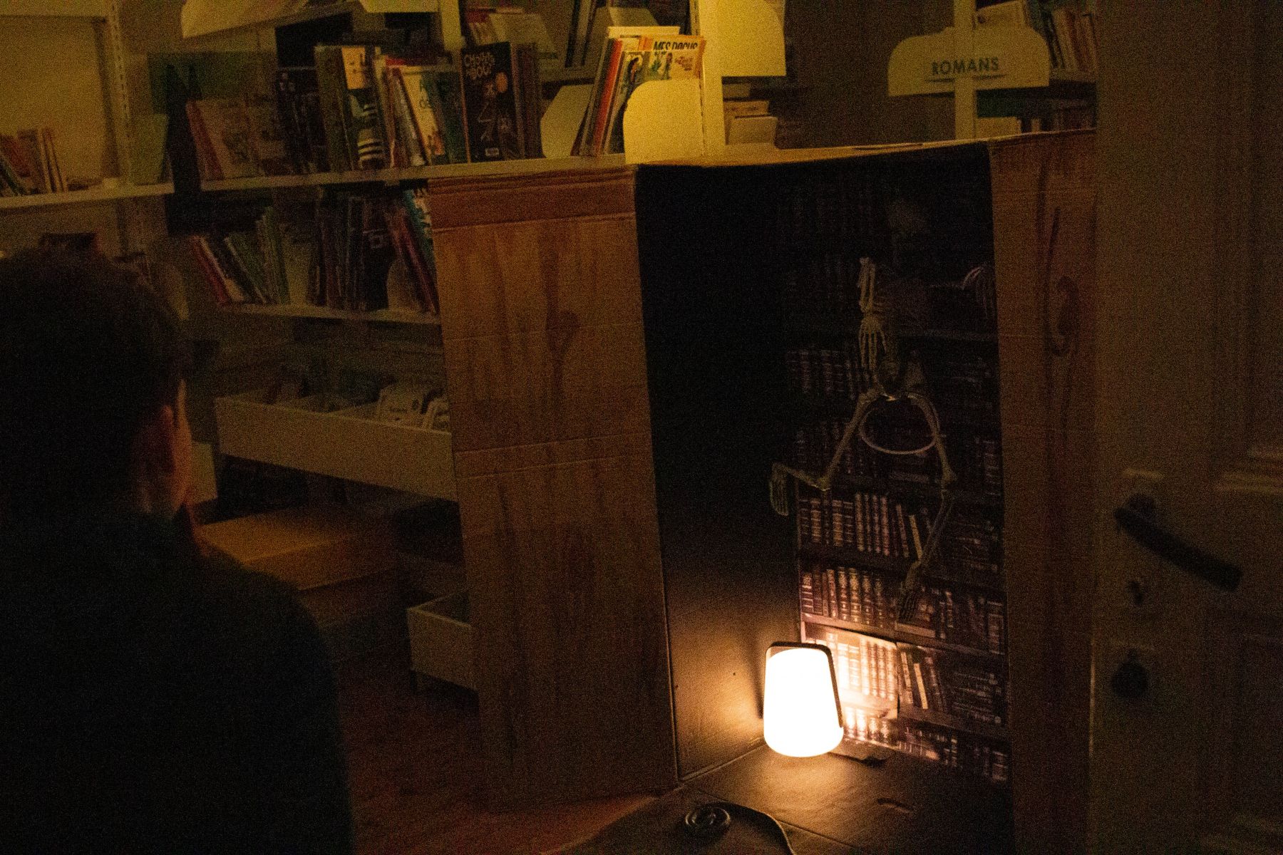 La bibliothèque s'est pourvue d'une étagère supplémentaire pour l'occasion... avec de nombreux livres de chirurgie gardés par un squelette un peu énervé...