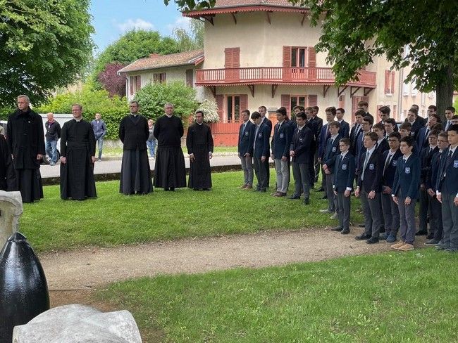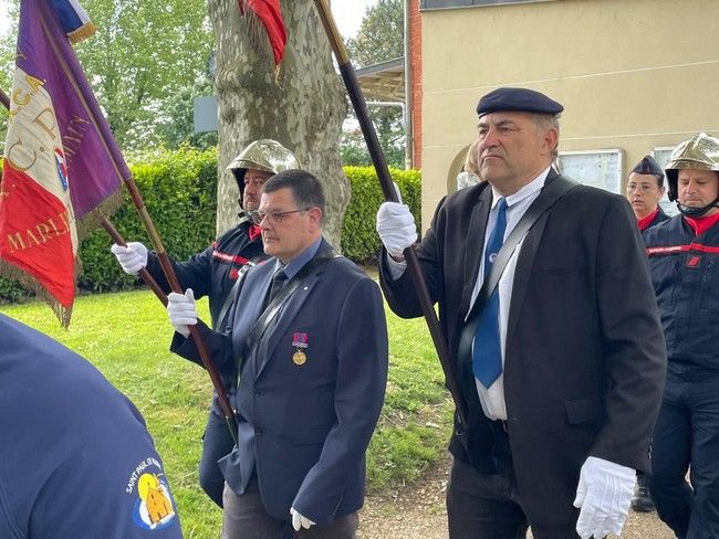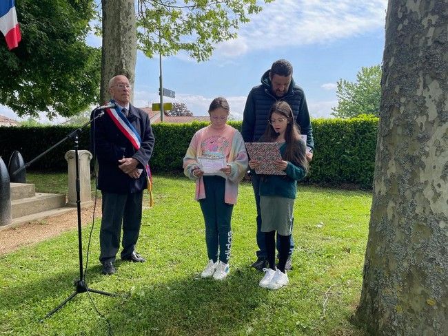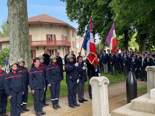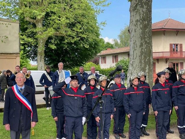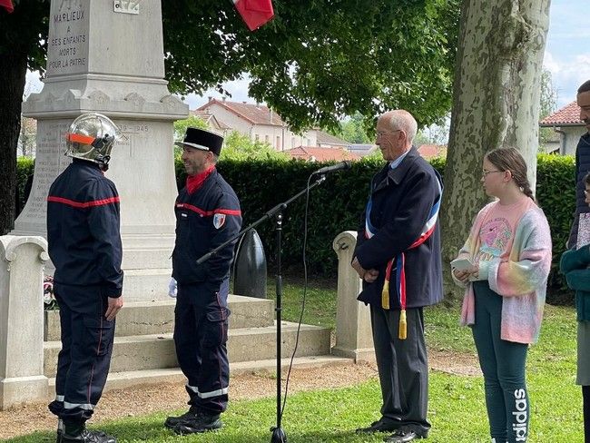 Pour le 80ème anniversaire de la fin de la dernière guerre , cérémonie au Monument aux morts de Marlieux en présence des élus du village et de Saint Germain , de la compagnie des sapeurs pompiers , d'anciens combattants , des enfants et enseignants de l'école saint Jean Bosco , du porte -drapeau et du représentant du Souvenir Français.