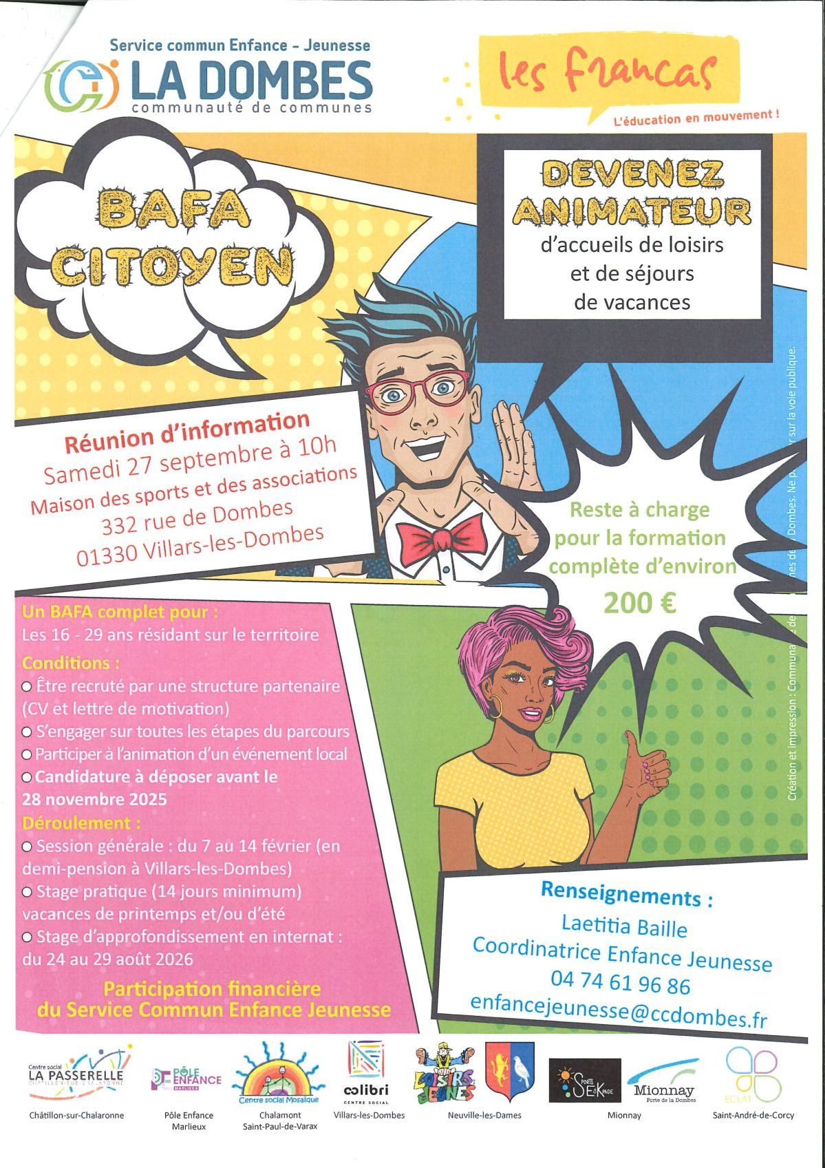 La Communauté de Communes de la Dombes organise une réunion d'information sur le BAFA Citoyen 2026, qui se déroulera le samedi 27 septembre 2025 à 10h00, à Villars-les-Dombes (Maison des sports et des associations)