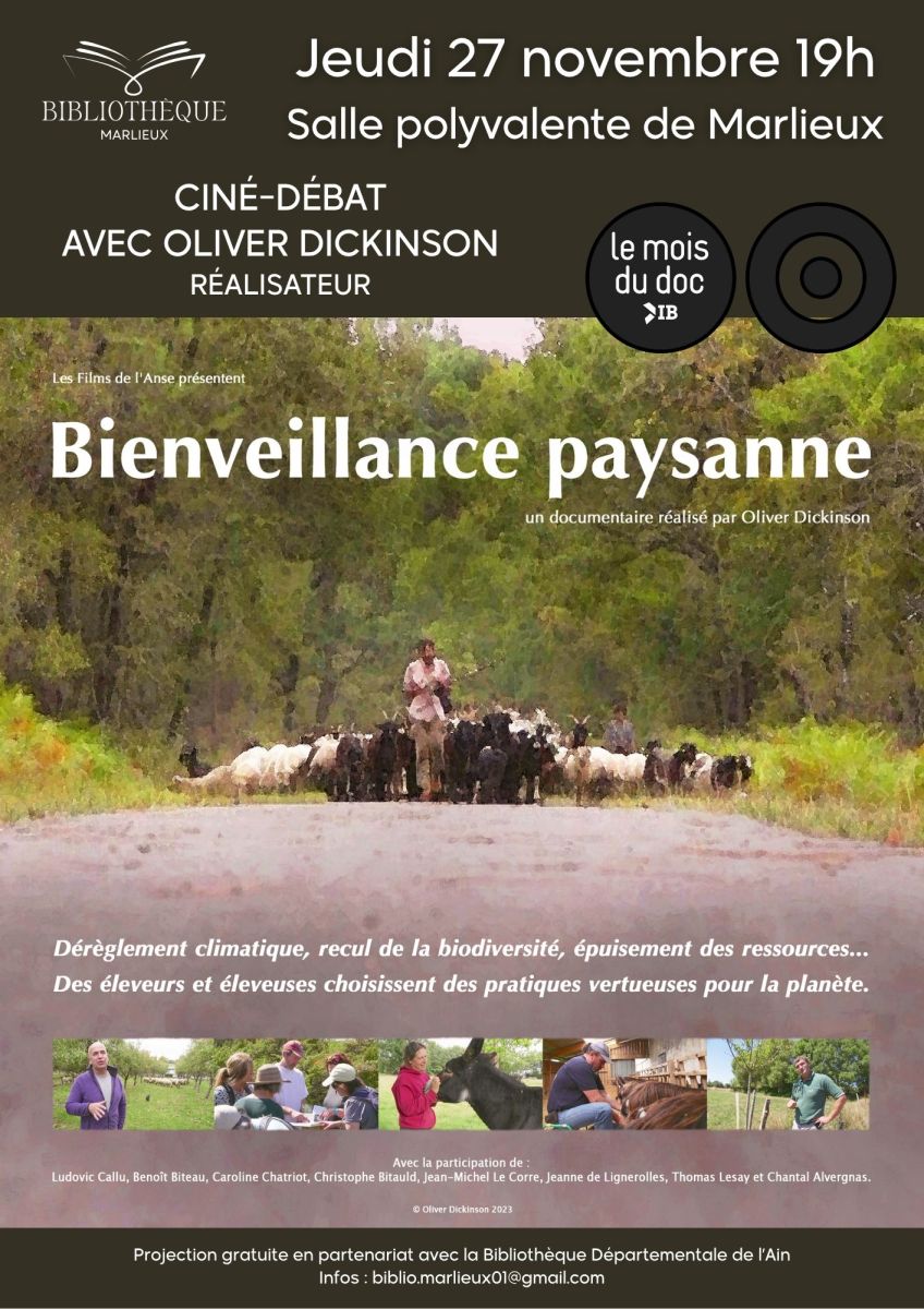 Dans le cadre du "Mois du film documentaire", la bibliothèque municipale de Marlieux, en partenariat avec la Bibliothèque Départementale de l'Ain, a organisé un ciné-débat le 27 novembre 2025 à la salle des fêtes de Marlieux.