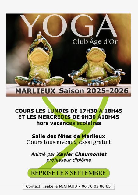 Suite au déménagement de Sylvie GOUT, les cours de yoga du lundi et du mercredi ont été repris par Xavier CHAUMONTET, sous la houlette du Club de l'Age d'Or.