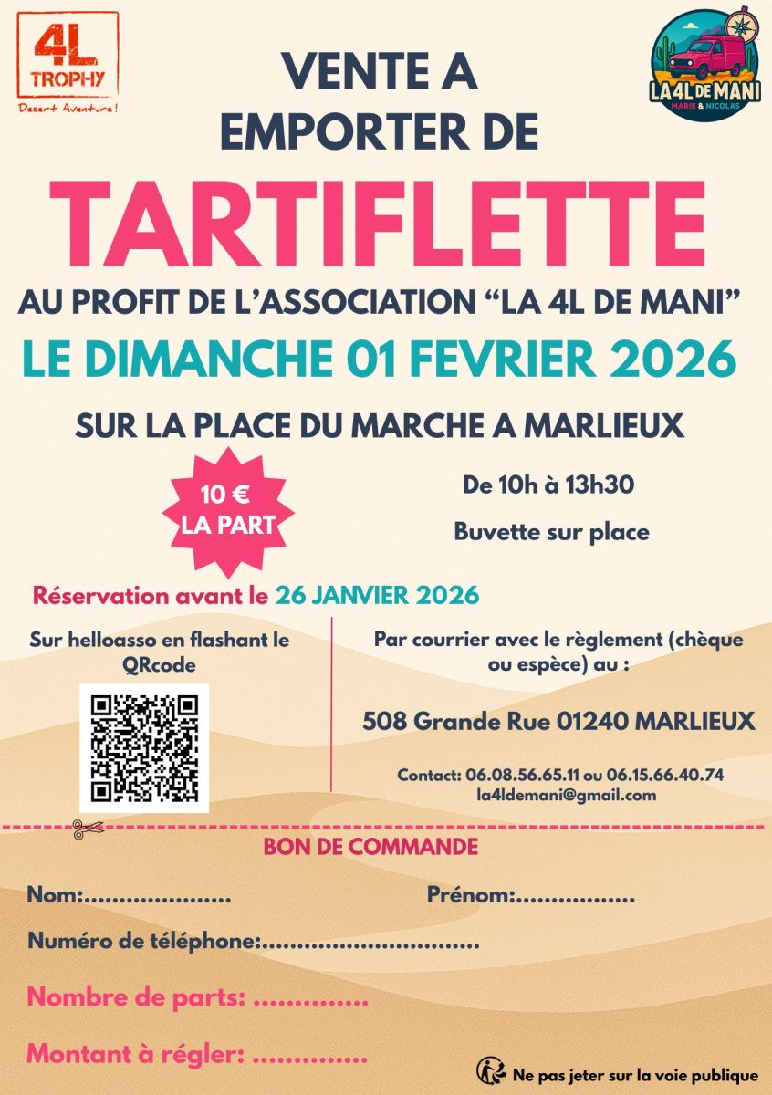 L'association "La 4L de Mani" organise une vente à emporter de tartiflette, le dimanche 1er février 2026.