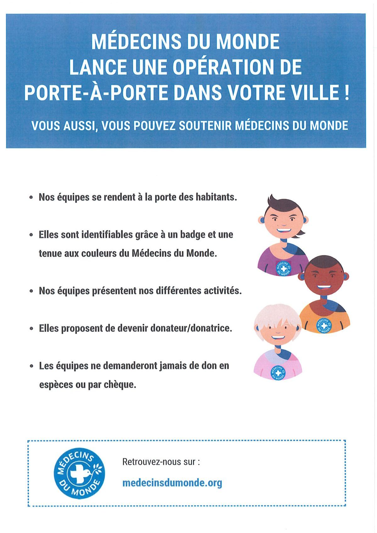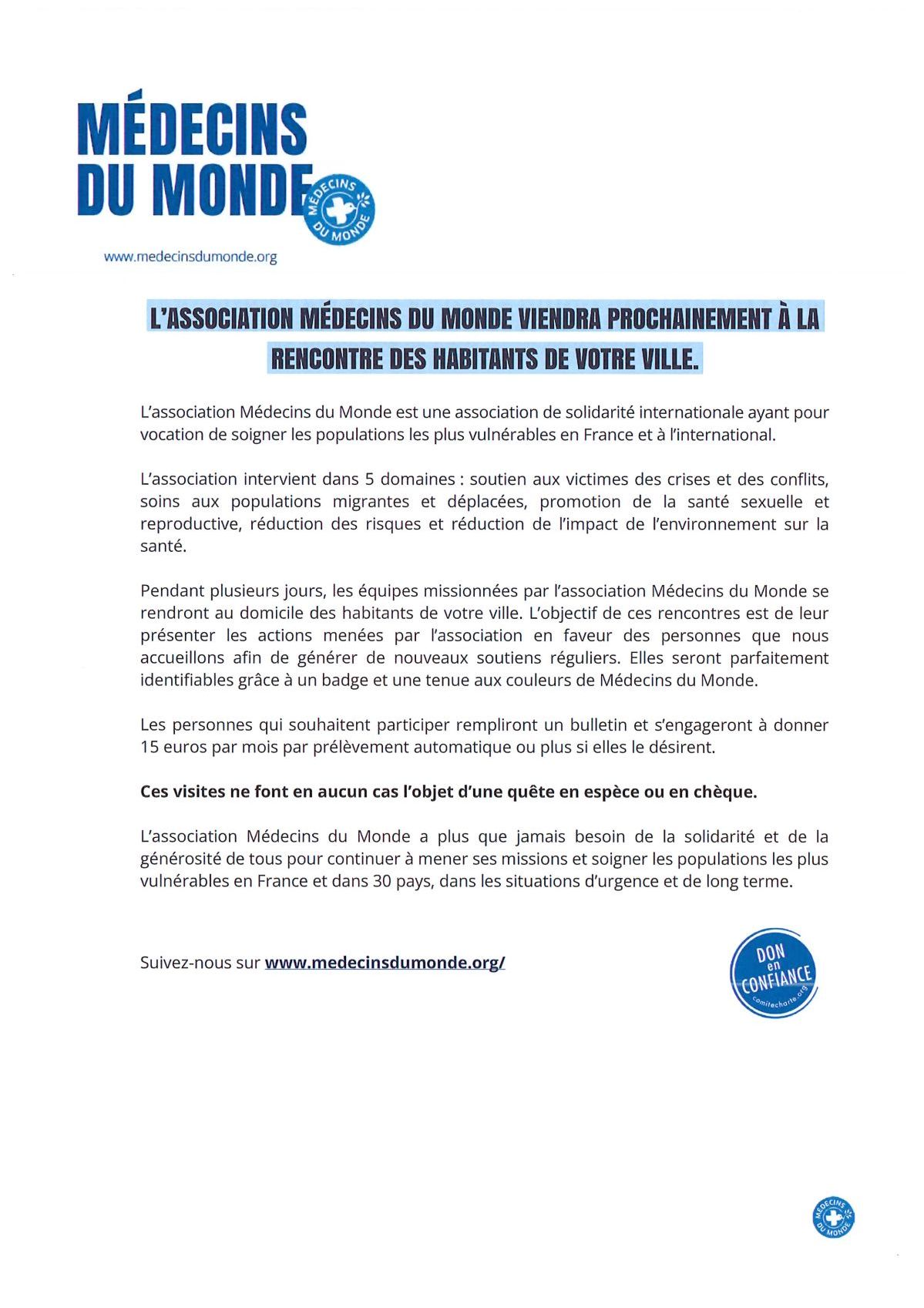 L'association "MÉDECINS DU MONDE" nous informe qu'une campagne de sensibilisation en porte-à-porte aura lieux sur la commune du 2 février 2026 au 28 février 2026, à raison de 3 jours maximum.