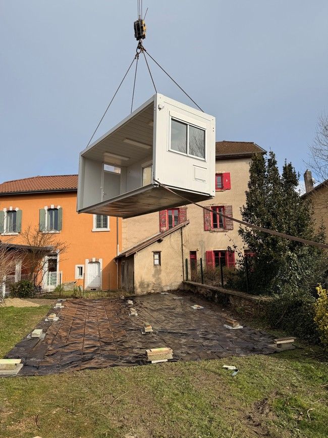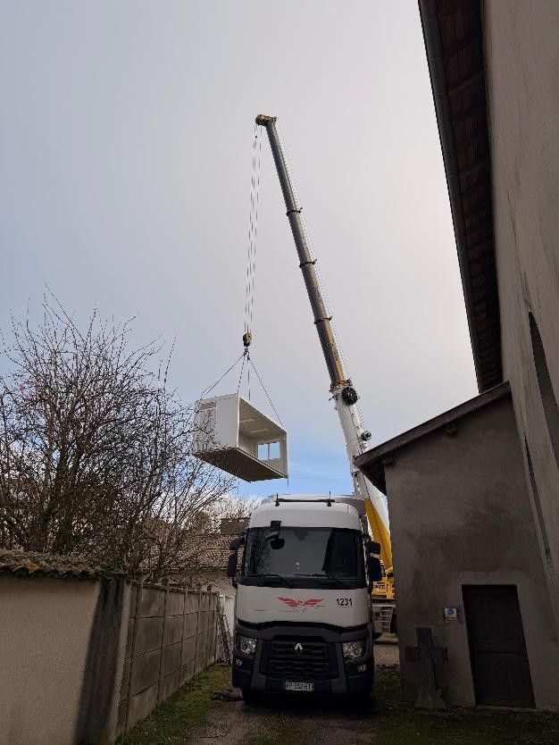 Lundi 9 février : profitant des vacances scolaires , la municipalité , en collaboration avec les communes de Saint Germain et La Chapelle du Chatelard , a installé un bâtiment préfabriqué type " Algeco" derriere la cantine scolaire , pour transposer la classe jouxtant le réfectoire et agrandir celui-ci. Ce sont 4 modules qui ont du être passés par dessus le toit de la cantine pour être assemblés.