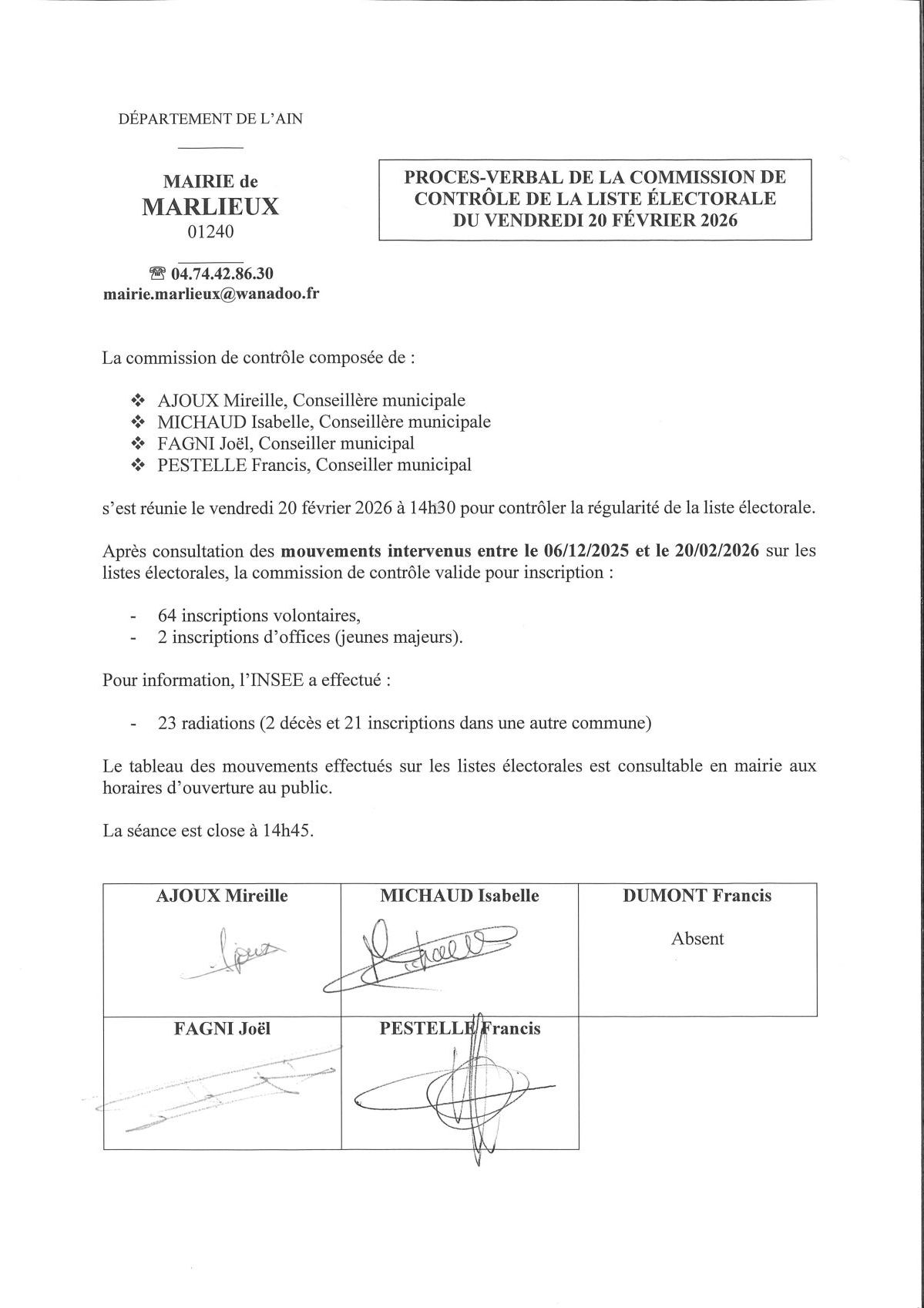 La prochaine commission de contrôle des listes électorales aura lieu le vendredi 20 février 2026 à 14h30, à la mairie de Marlieux