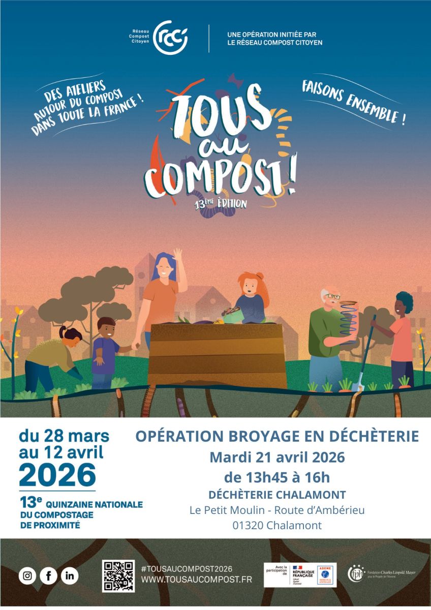 Dans le cadre de la 13ème quinzaine nationale du compostage de proximité, une opération de broyage est organisée à la déchèterie de Chalamont le mardi 21 avril 2026 (13h45-16h00).