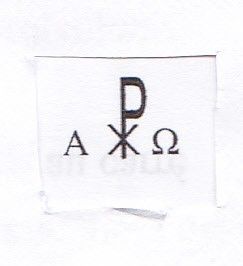 L' inscription au centre du croisillon représente le monogramme du christ en grec. La première lettre signifie le commencement et la dernière la fin de toute chose comme sur le Cierge Pascal. Entre les deux : la Paix du Christ.