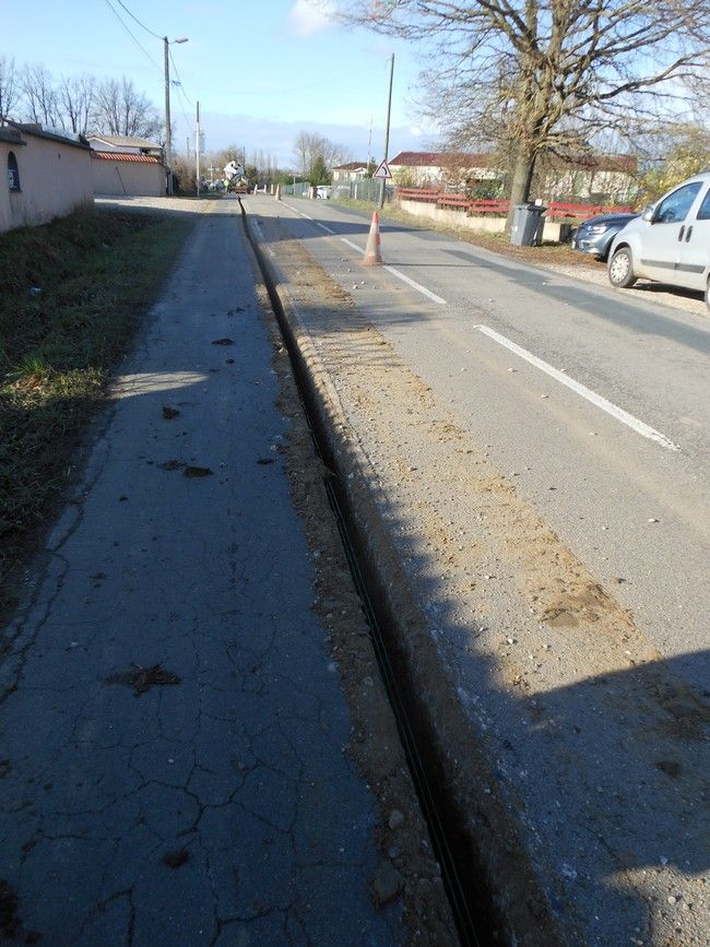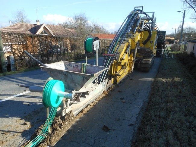 Une mini tranchée est effectuée soit sur route soit sur l'accotement pour poser le câble, au rythme de 700 m par jour , par une machine spéciale qui fait une découpe très précise et étroite.