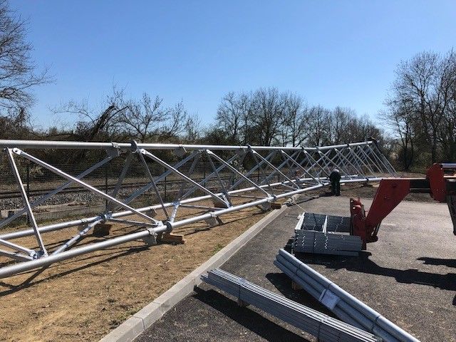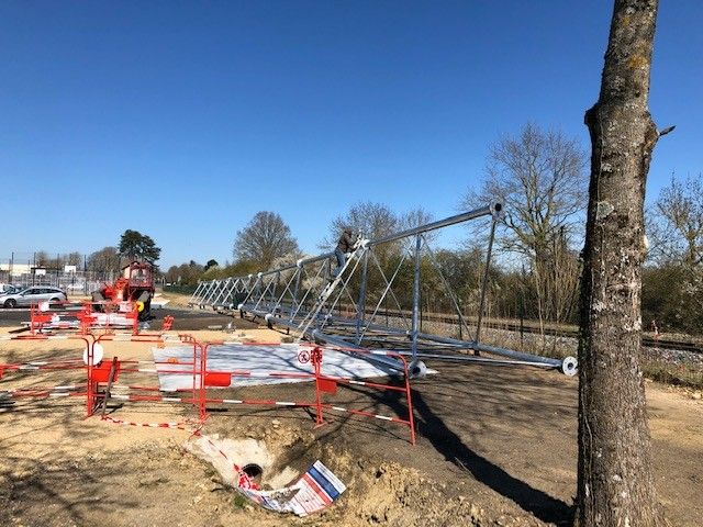Ils ont débuté; mise en place de la grue faite fin avril et début de la pose des murs pré fabriqués. Le chantier a été arrêté une quinzaine de jours du fait du risque lié à la présence de la ligne électrique pour la manipulation de la grue. Il a repris début juin 2018.