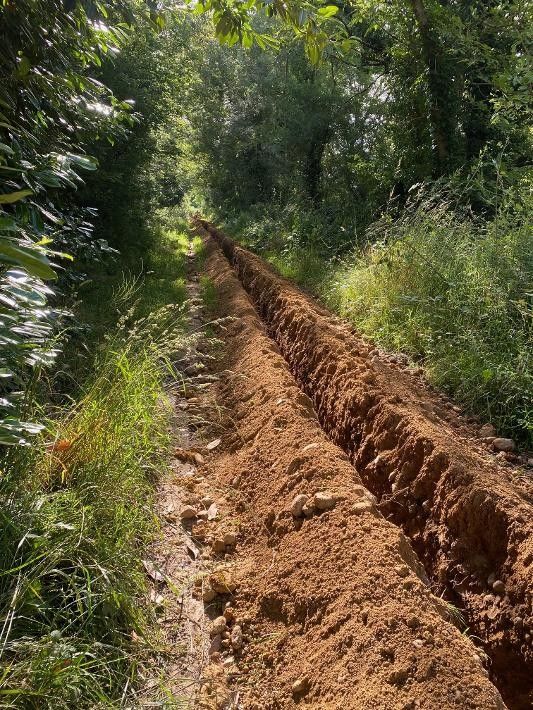 Juin 2024 : reprise de travaux avec mise en place du réseau entre le lavoir et l'armoire posée devant la Mairie,en utilisant la chaussée de l'étang du village pour éviter des travaux dans la rue principale.