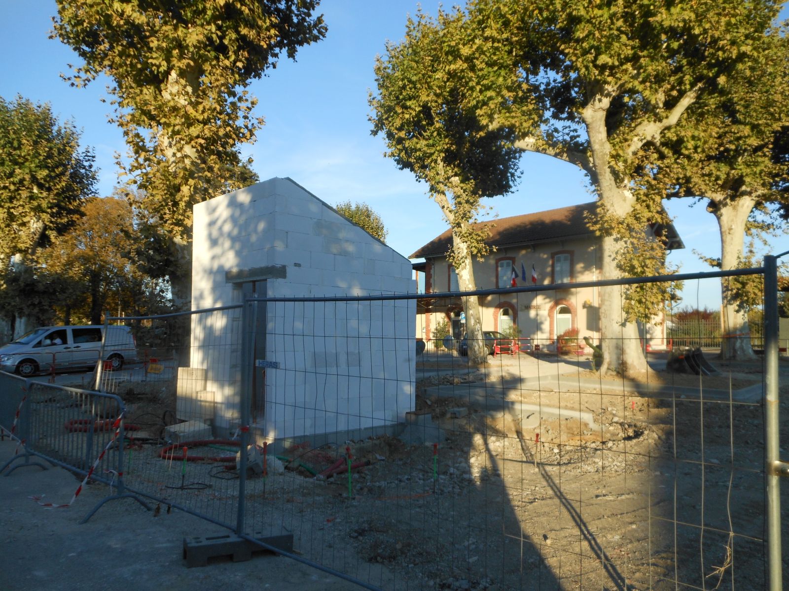 Mars 2025 : aménagement de l'espace central de la place du Marché , suite à la reconstruction de l'immeuble incendié.
