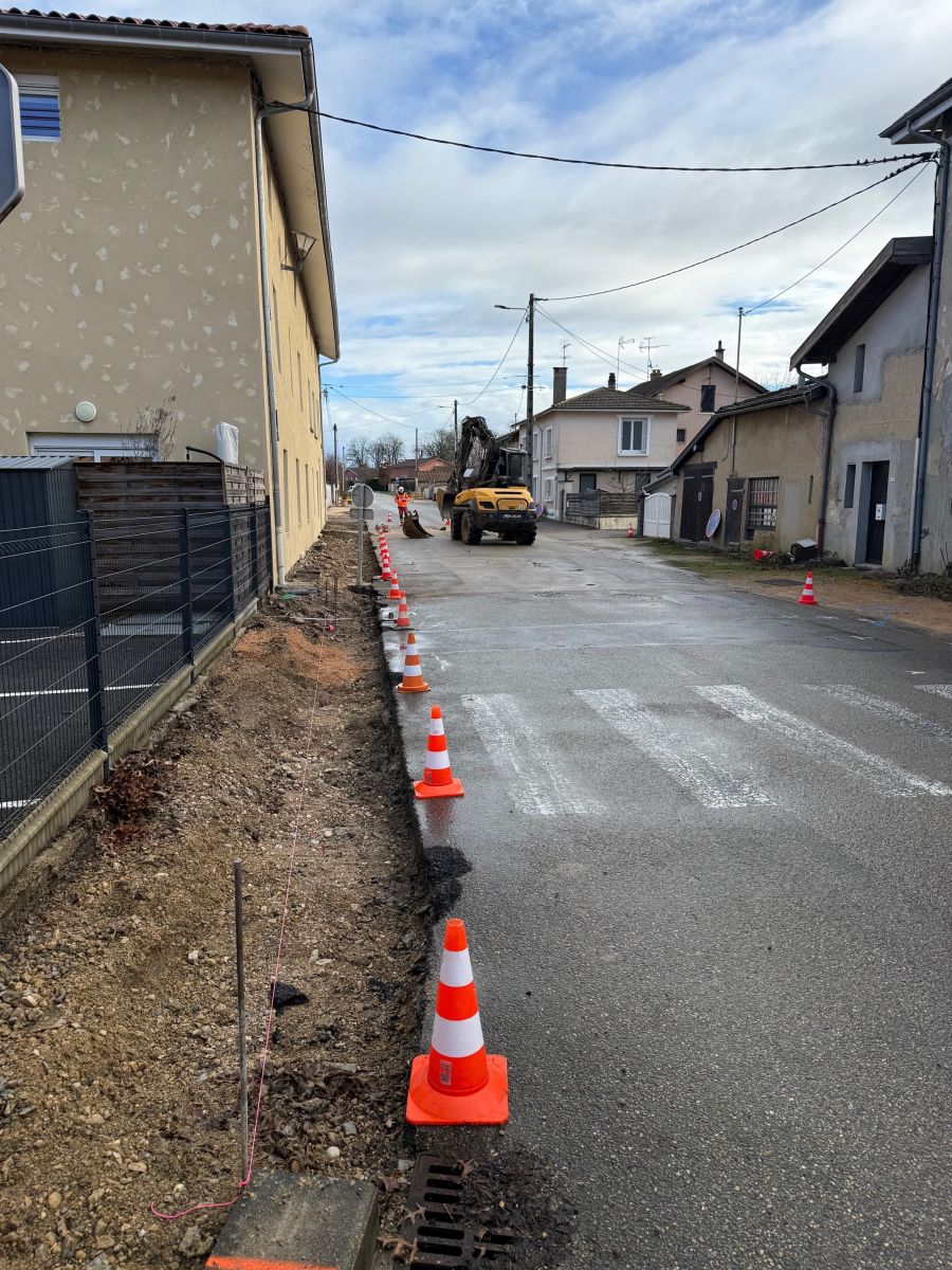 Janvier 2026 : le 28 début des travaux consistant à buser le fossé qui suit la route depuis le panneau d'entrée en agglomération pour permettre la circulation des piétons-vélos et réduire la vitesse.