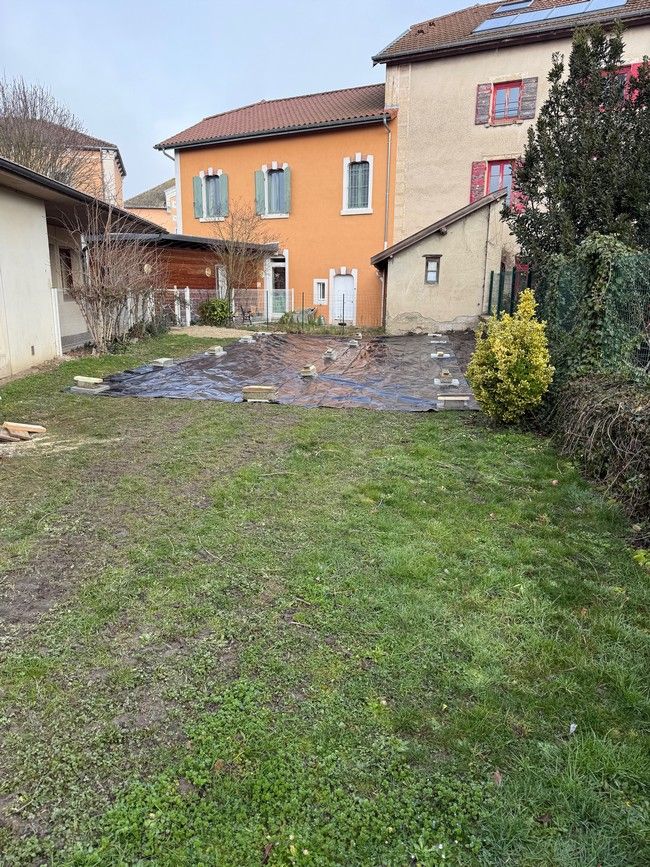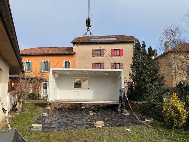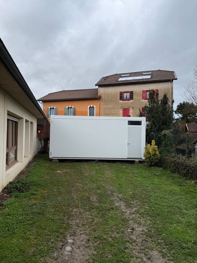 Lundi 9 février : profitant des vacances scolaires , la municipalité , en collaboration avec les communes de Saint Germain et La Chapelle du Chatelard , a installé un bâtiment préfabriqué type " Algeco" derriere la cantine scolaire , pour transposer la classe jouxtant le réfectoire et agrandir celui-ci. Ce sont 4 modules qui ont du être passés par dessus le toit de la cantine pour être assemblés.